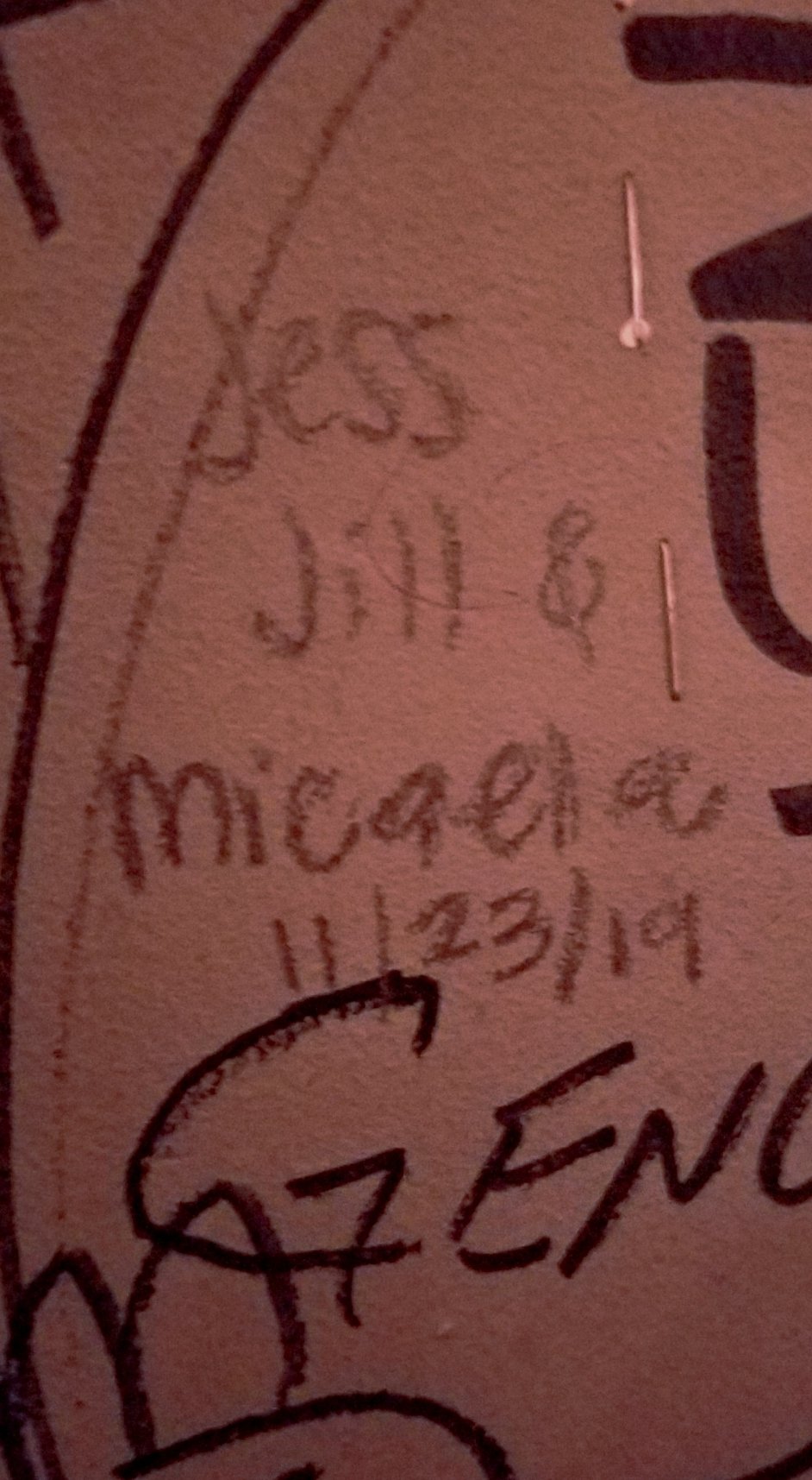 The bar began to fill rapidly, with the usual Saturday suspects. Our drinks were ready for refills, and we were reading out loud a few of the handwritten love, hate, and drunk messages off the wall nearest our table. Our table roaring with shouts, heads back, howling with laughter.